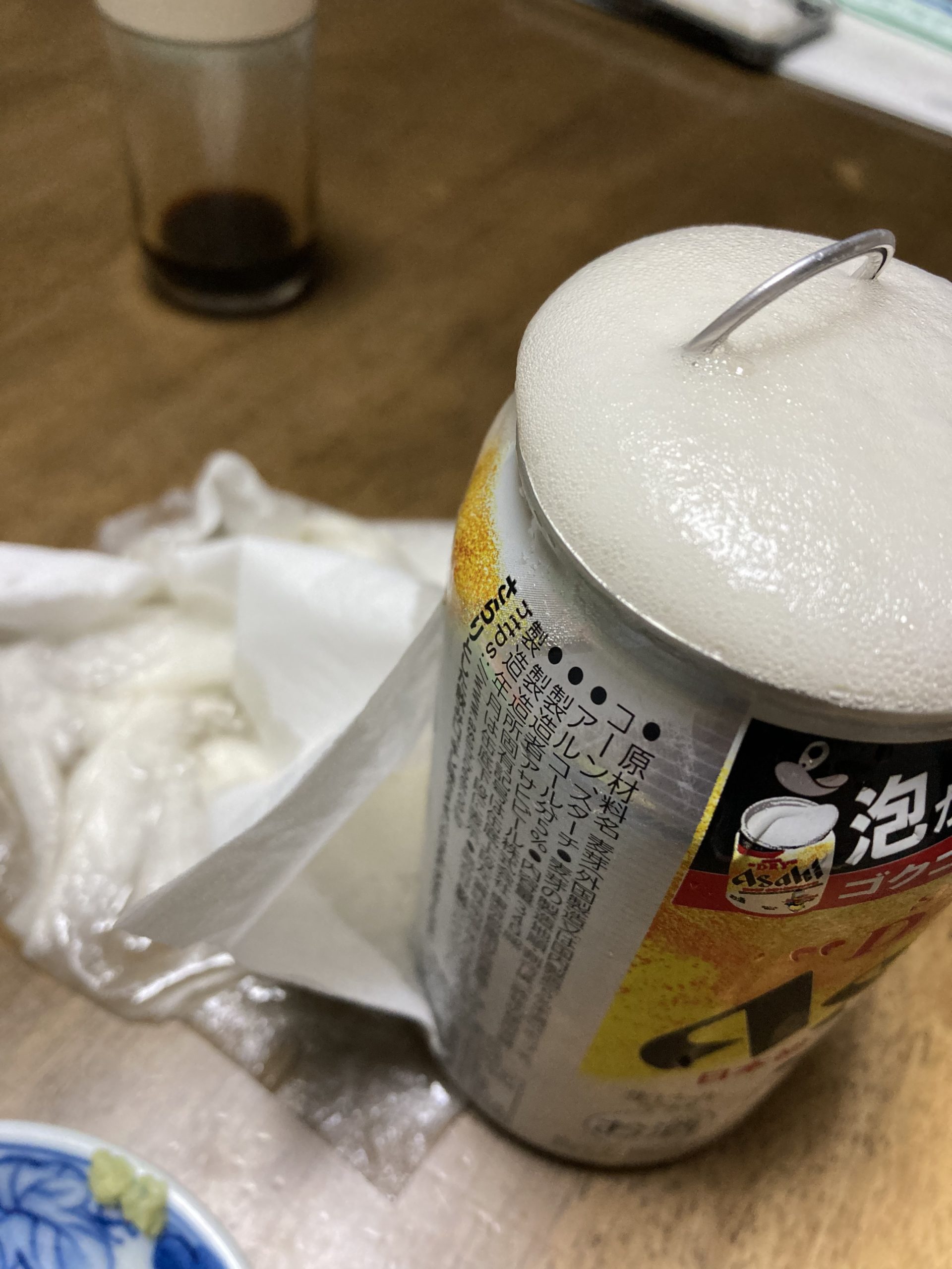 「今度は溢れたー。」妻さん横にした状態で野菜室に入れていたよう。横にしてたからかなーっと妻さん。かなり泡がこぼれましたー。