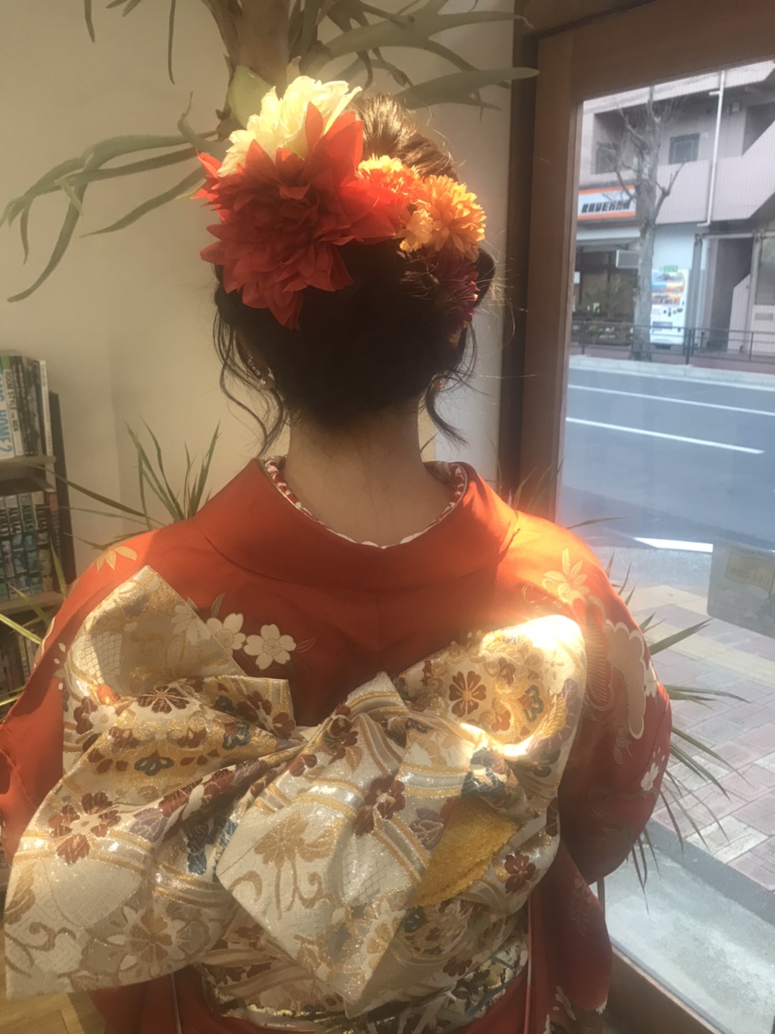 できましたー。着物にあわせるといいですねー。華やかでーー。