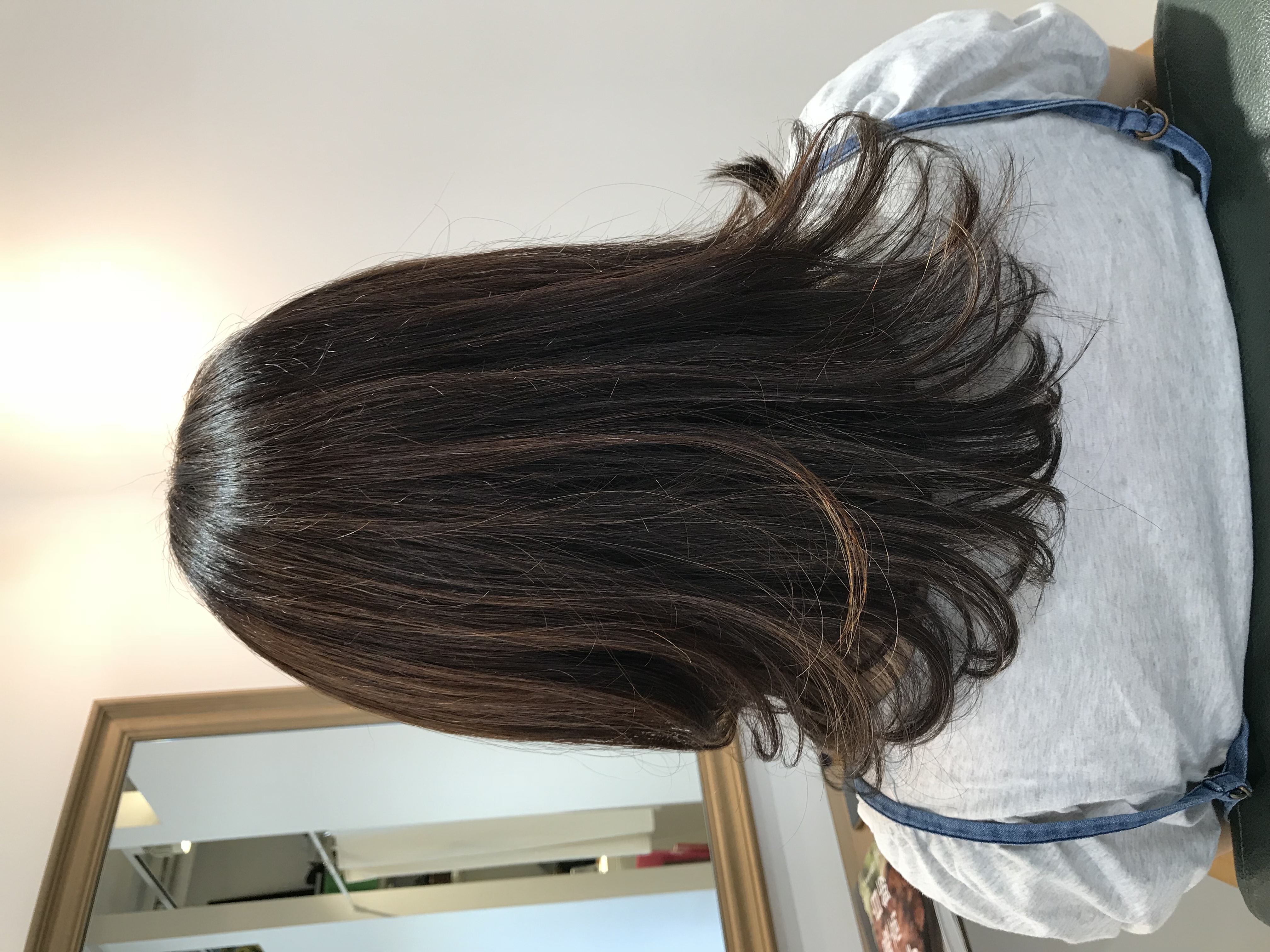 明るく見えているヘアーは白髪が染まったもの。暗く見えているヘアーは黒い髪が染まったものです。