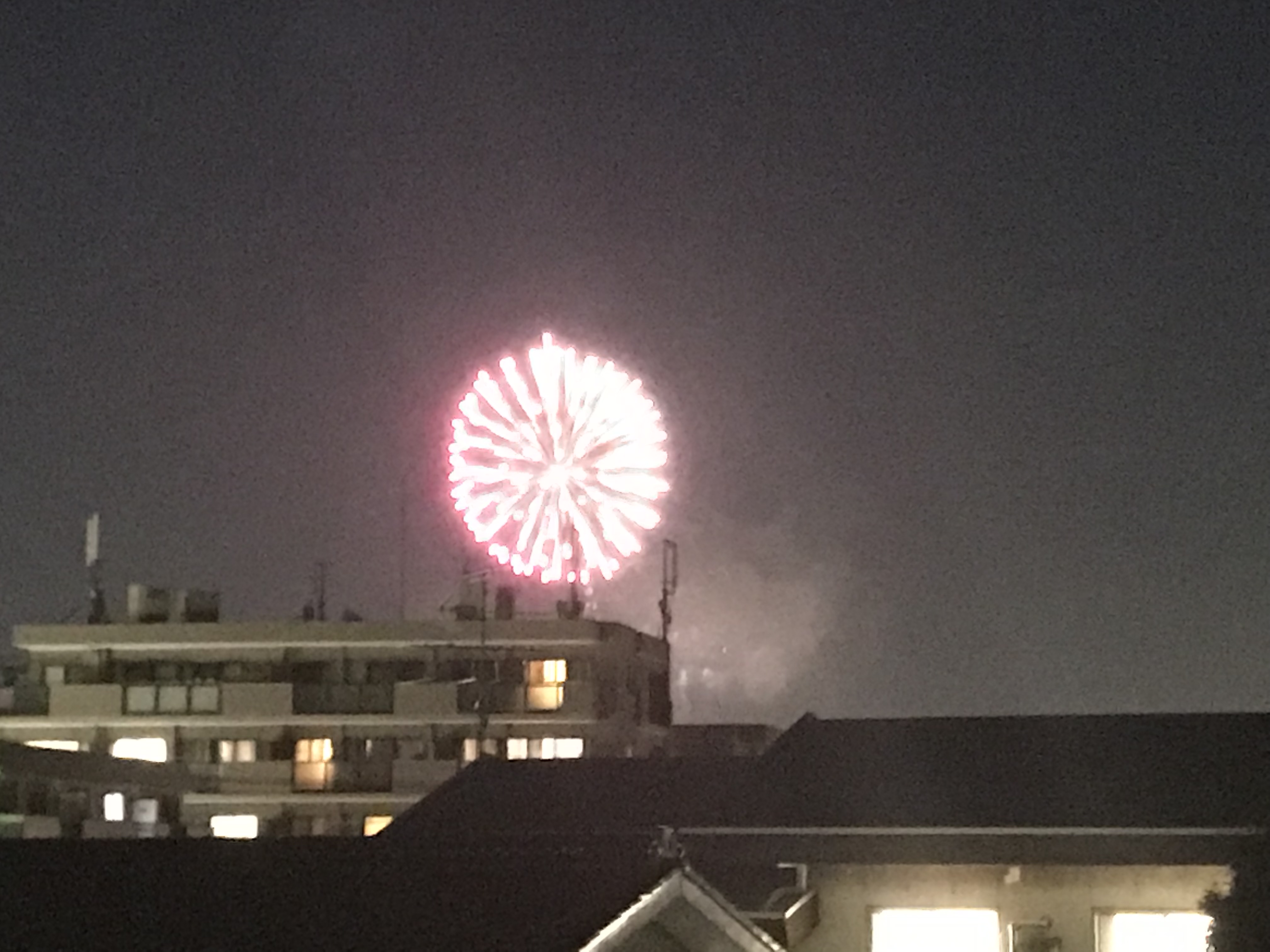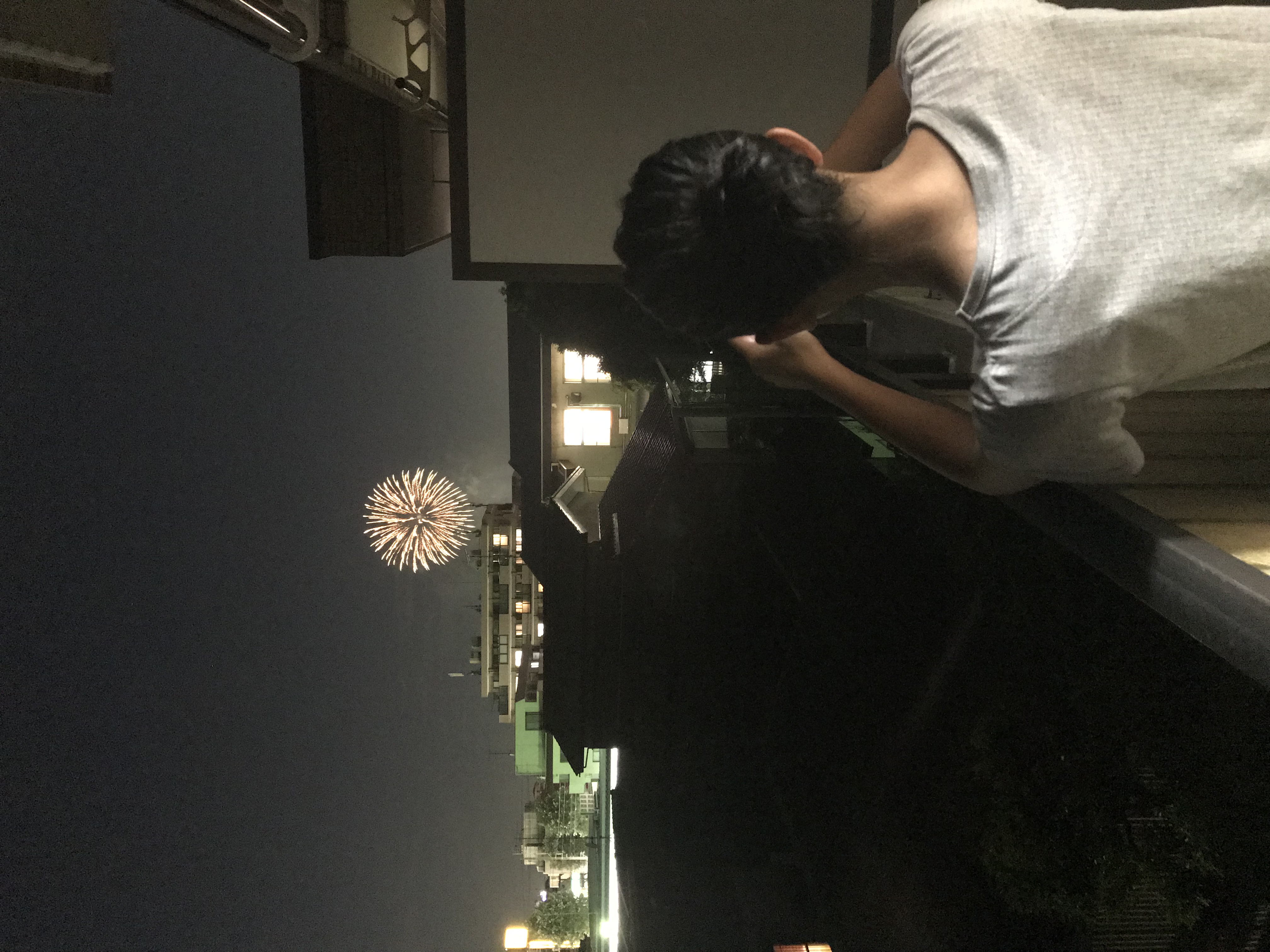 家に帰ってきたら近所(狛江)で花火大会!!家から近いのでベランダで娘とまったり!!
